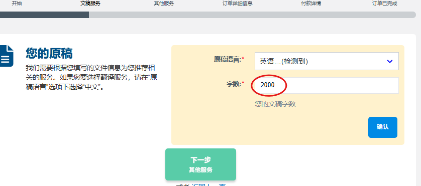 第二步,进入订单提交流程。请在选择服务的页面输入无须处理部分后的正确字数。