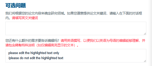 第三步,请在"额外需求“的对话框内添加无须处理某部分内容的提示, 例如"do not edit highlighted text"。这些特殊提示将会直接发送给编辑,这样他们会知道哪些部分不需要处理。