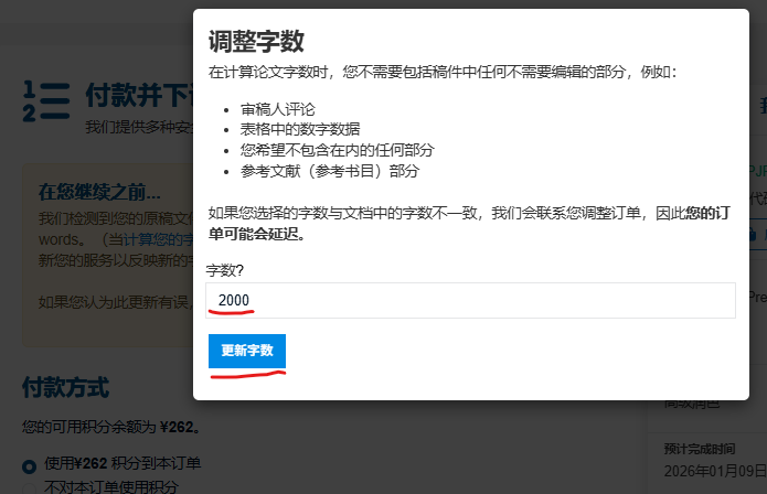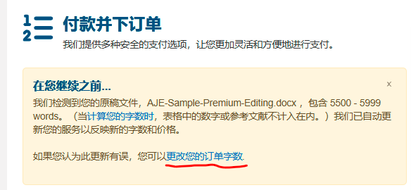 第四步 在进入支付环节时,请点击“更改您的订单字数”并再次输入正确的字数,收到您订单后,编辑会再次人工统计文稿的字数,如果发现有任何问题,我们会及时和您邮件联系。